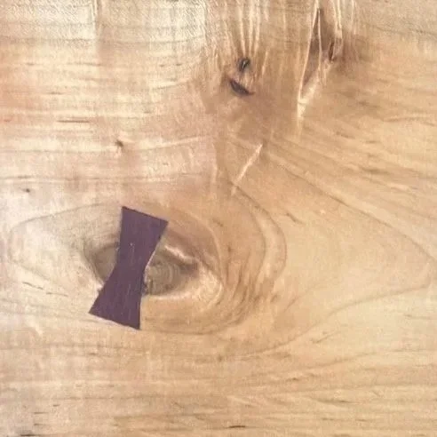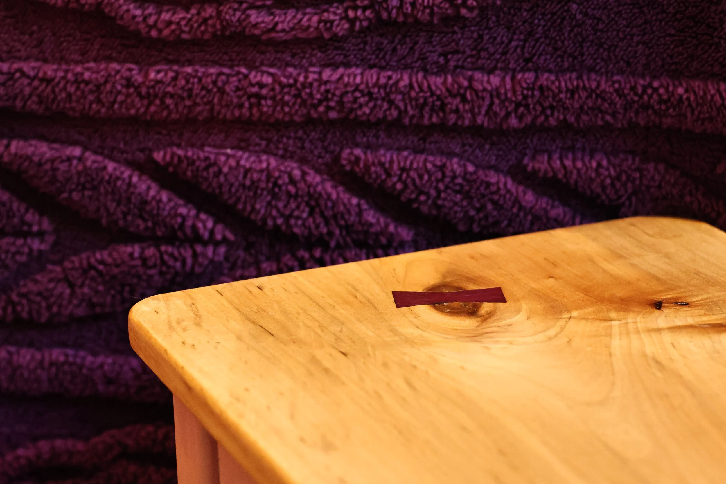 The purple heart inlays emphasize the imperfections in the wood. Their placement mimics the footsteps one would take when using the stool.