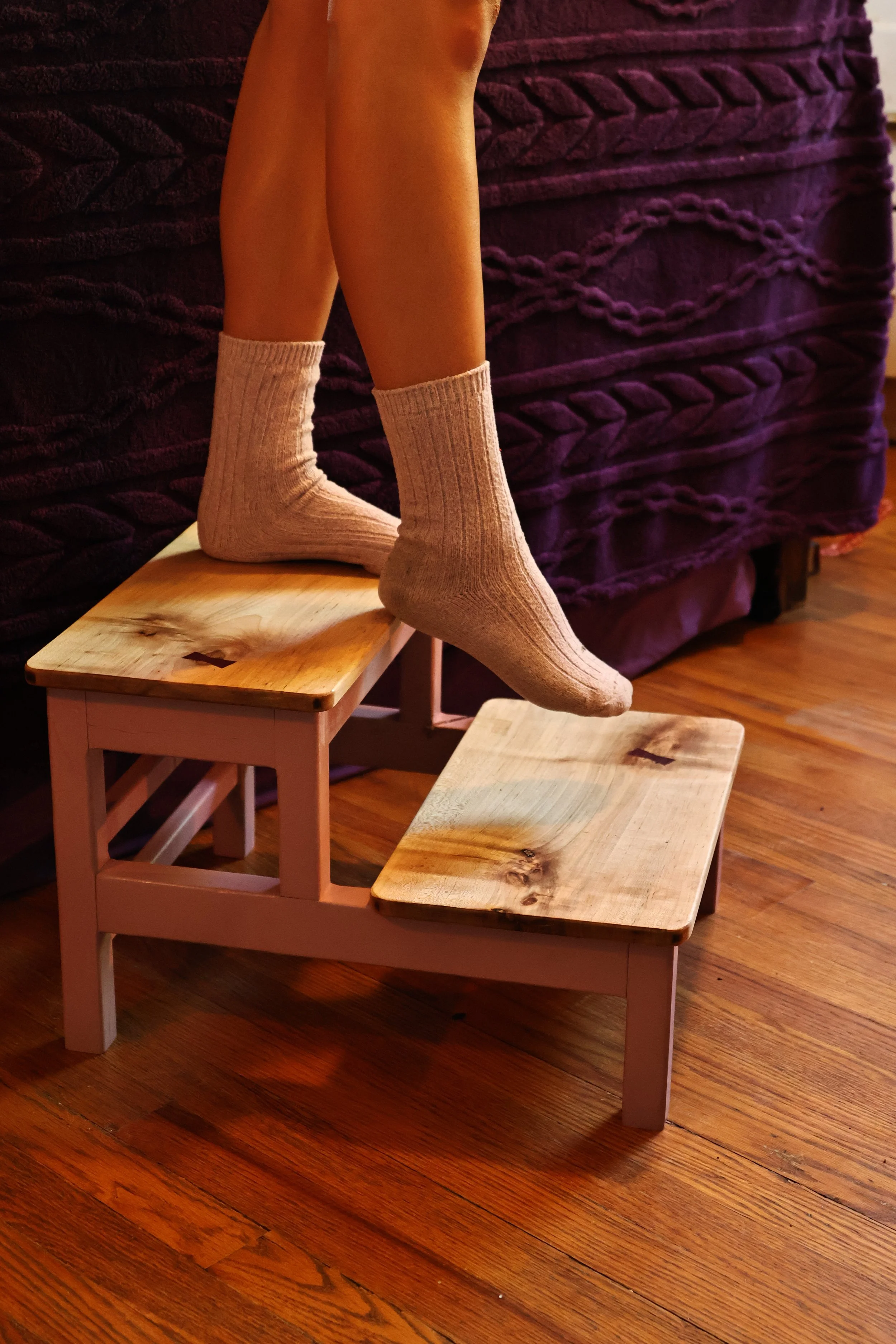 The proportions of the step stool were designed to mimic the ergonomic height and width of each step on a staircase. This allows for easy, natural movement when stepping.